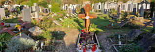 Ein Spaziergang über den St.-Leonhard-Friedhof ist auch ein ästhetisches Erlebnis – schöne Grabsteine, gepflegte Gräber, jetzt im November besonders liebevoll geschmückt. Gemma ham steht auf dem Weg zum Gräberfeld des Vinzidorfs. Irgendwann sollte auch ich wissen, wo und wie ich begraben werden will. Rein virtuell gedacht, könnte ich mir meine letzte Ruhestätte in einem Kärntnerlied vorstellen, da stirbt man in der 3. Strophe sowieso. Aber immer die gleiche Melodie, das nervt vielleicht sogar Tote. Meine Eltern sind in Klagenfurt begraben. Ein vor sich hin rostender schmiedeeiserner Zaun verströmt dort seinen morbiden Charme. Die Eltern haben es mir leicht gemacht und so ziemlich alles vorweg festgelegt.